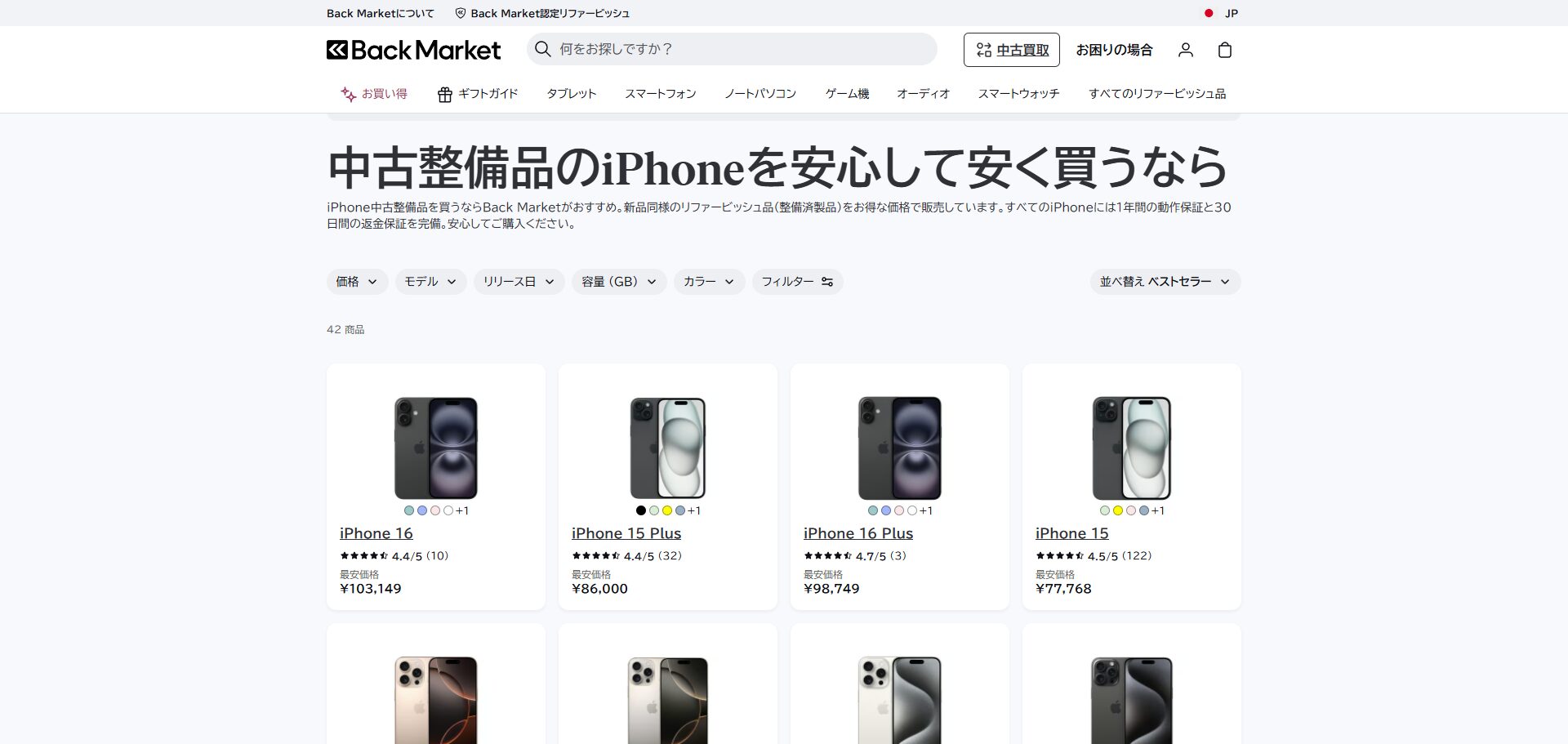 URLの確認(“https://www.backmarket.co.jp/ja-jp”からはじまるものが正しいです)はもちろん、価格が変に安すぎないか等、とくに検索から訪問するときは慎重になりましょう。