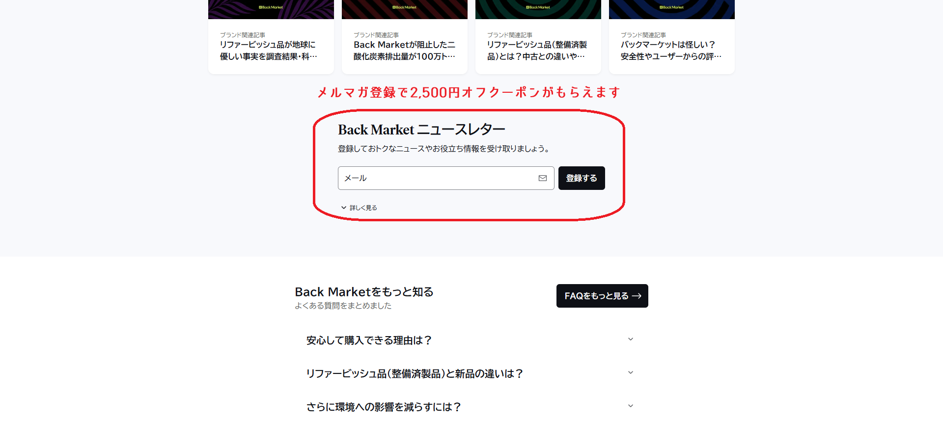 とりあえず知っておきたいのは初回クーポンコード。バックマーケットにメールアドレスを登録(メルマガ登録)するだけで、税込み40,000円以上の購入で使える2,500円オフのクーポンコードがもらえます。iPhoneを買うなら4,0000円を超えてくることが多いので、なかなか使いやすいクーポンです。