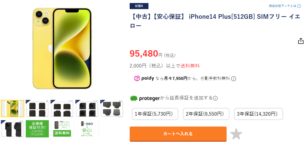 iPhone 14 Plusは発売当初iPhone 14シリーズの中ではおそらく人気があまりなかった機種で、中古の在庫数は少なめです。さらにストレージを512GBに拡張したものは、他のショップだと1台あるかないかというレベル。しかし規模の大きいゲオなら複数台在庫が見つかります。