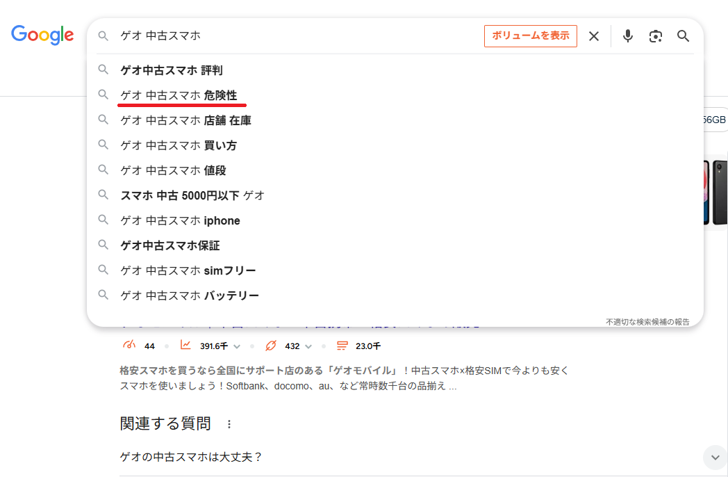 検索に「ゲオ 中古スマホ」と打つと“危険性”と出てきますが、不安に思う必要はありません。中古スマホを販売するショップでは、こうしたネガティブなワードが検索候補に出てくるのはよくあることです。