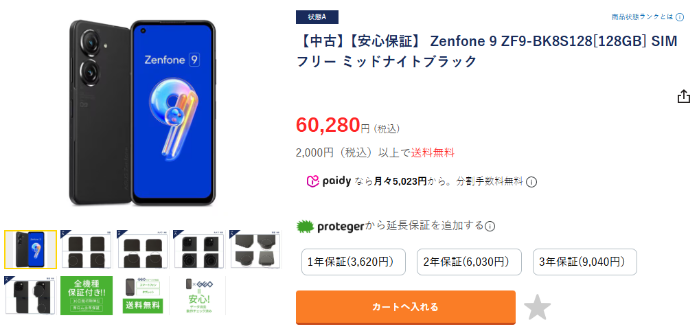 Zenfone 9の発売時の価格は99,800円~。Aランク商品でも60,280円なので今だとだいだい3割引き程度の価格です。