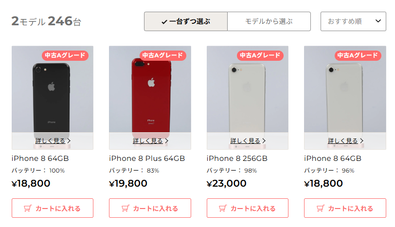 中にはバッテリー容量100%でほぼ新品状態のiPhone 8も発見できました。状態が良い分少し価格は高めですが、長く付き合っていきたいならおすすめです。